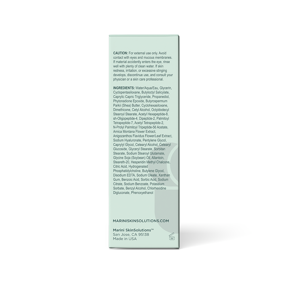 Water/Aqua/Eau, Glycerin, Cyclopentasiloxane, Butyloctyl Salicylate, Caprylic/Capric Triglyceride, Propanediol, Phytonadione Epoxide, Butyrospermum Parkii (Shea) Butter, Cyclohexasiloxane, Dimethicone, Cetyl Alcohol, Octyldodecyl Stearoyl Stearate, Acetyl Hexapeptide-8, sh-Oligopeptide-4, Dipeptide-2, Palmitoyl Tetrapeptide-7, Acetyl Tetrapeptide-2, N-Prolyl Palmitoyl Tripeptide-56 Acetate, Arnica Montana Flower Extract, Anigozanthos Flavidus Flower/Leaf Extract, Sodium Hyaluronate, Pentylene Glycol, Caprylyl Glycol, Cetearyl Alcohol, Cetearyl Glucoside, Glyceryl Stearate, Sorbitan Stearate, Sodium Stearoyl Glutamate, Glycine Soja (Soybean) Oil, Allantoin, Steareth-20, Hesperidin Methyl Chalcone, Citric Acid, Hydrogenated Phosphatidylcholine, Butylene Glycol, Disodium EDTA, Sodium Oleate, Xanthan Gum, Benzoic Acid, Sorbic Acid, Sodium Citrate, Sodium Benzoate, Potassium Sorbate, Benzyl Alcohol, Chlorhexidine Digluconate, Phenoxyethanol