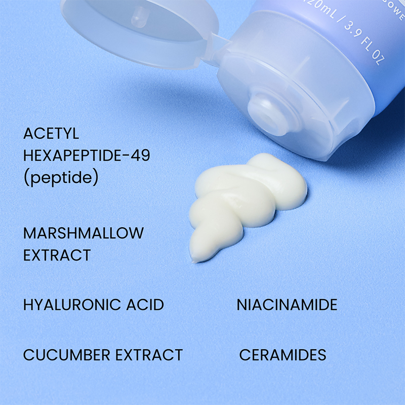 The pH-balanced, non-comedogenic formula transforms into a silky micro-lather. Hyaluronic acid and cucumber extract hydrate, while peptides, ceramides, and marshmallow extract leave skin soft and soothed.