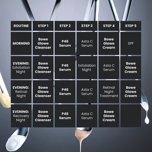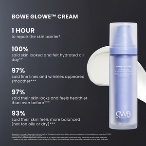 Bowe Glowe™ Cream: water (aqua), propanediol, caprylic/capric triglyceride, squalane, glycerin, sodium acrylates copolymer, butyrospermum parkii (shea) oil, helianthus annuus (sunflower) seed oil, punica granatum sterols, lactobacillus ferment, inulin, ceramide NP, sodium hyaluronate, alpha-glucan oligosaccharide, lecithin, bisabolol, tocopheryl acetate, hydroxydecyl ubiquinone, acrylates/C10-30 alkyl acrylate crosspolymer, ammonium acryloyldimethyltaurate/VP copolymer, maltodextrin, silica, sodium phytate, ethylhexylglycerin, phenoxyethanol, mica, titanium dioxide (CI 77891).
