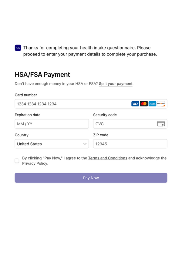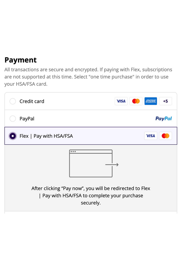 Pay with HSA/FSA. If you don't have your HSA/FSA card handy, you can also check out with a regular credit or debit card and submit your receipt to your HSA/FSA administrator for reimbursement. Please note that subscriptions with Flex payments are not available at this time.