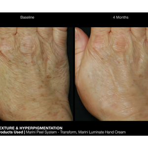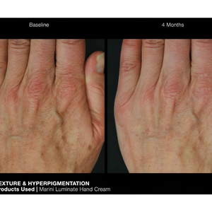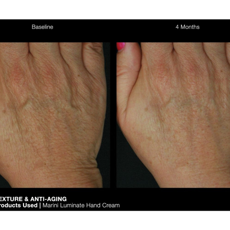 This patented formulation takes a multi-dimensional approach to targeting visible signs of aging on the hands. Improving the visible signs of aging on the hands (including texture, wrinkles and discoloration) requires a multi-dimensional approach. Patented Marini ReNu does this through a combination of retinol, alpha arbutin, azelaic acid, licorice root extract, vitamin C, Vitamin E and more. Marini ReNu is the only hand product shown to deliver significant improvement in a peer-reviewed medical journal (the Journal of Drugs & Dermatology) where physician assessment showed significant improvement in the appearance of texture, discoloration and fine lines and wrinkles. Marini ReNu is an exciting patented, multi-functional non-hydroquinone hand cream shown to brighten overall skin tone and decrease the appearance of wrinkles, uneven texture, and discoloration on the hands!