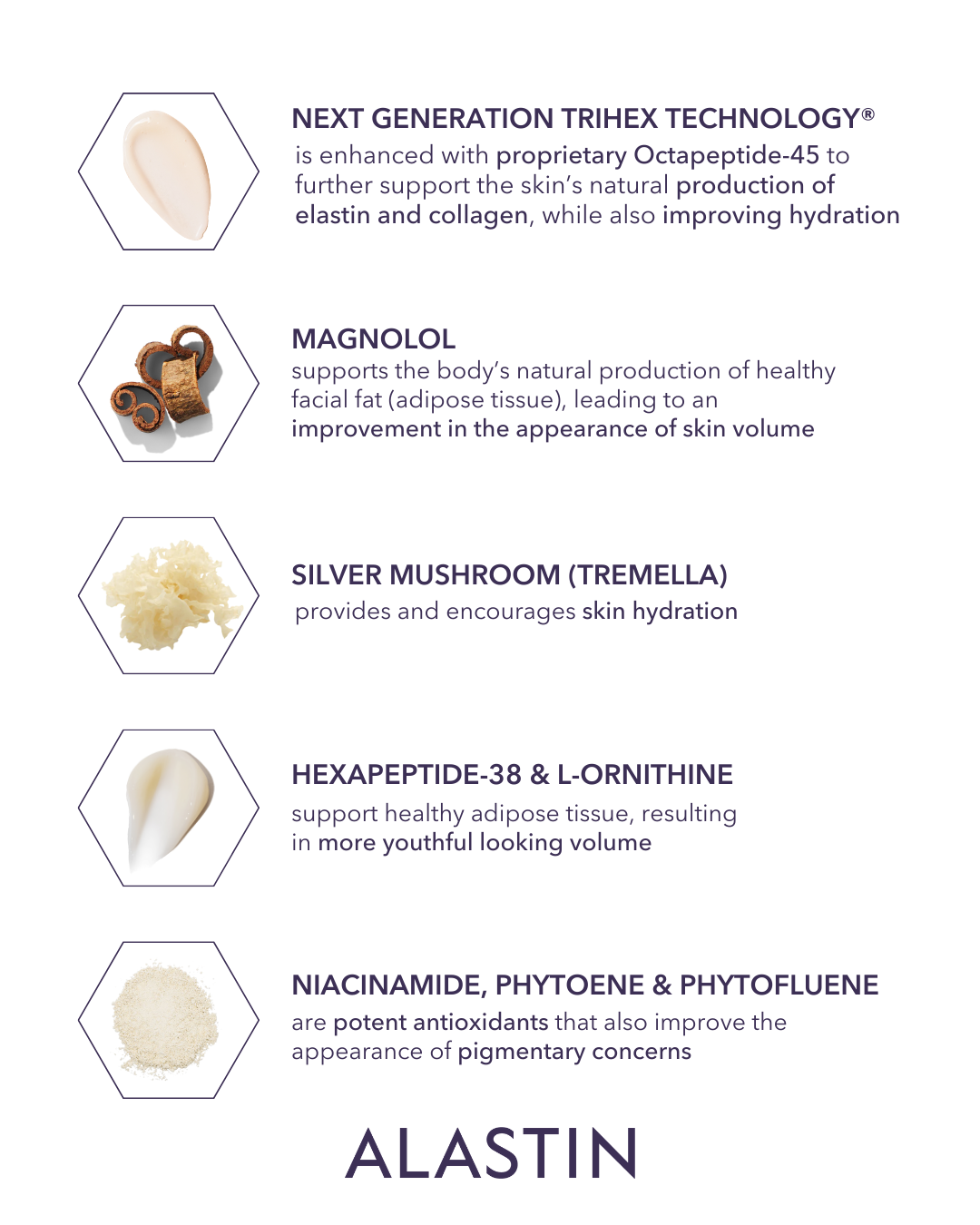 Water, Glycerin, Niacinamide, Isopropyl Palmitate, Polyacrylate-13, Butylene Glycol, Palmitoyl Hexapeptide-12, Palmitoyl Tripeptide-1, Palmitoyl Tripeptide-5, Palmitoyl Dipeptide-5 Diaminobutyroyl Hydroxythreonine, Palmitoyl Dipeptide-5 Diaminohydroxybutyrate, Acetyl Hexapeptide-38, Octapeptide-45, Swertia Chirata Extract, Magnolol, Ornithine, Ceramide AP, Ceramide NP, Ergothioneine, Dunaliella Salina Extract, Phytosterols, Phospholipids, Glycolipids, Tremella Fuciformis Sporocarp Extract, Caprylic/Capric Triglyceride, Sodium Stearoyl Glutamate, Stearic Acid, Betaine, Squalane, Lecithin, Caprylyl Methicone, Disodium EDTA, Polysorbate 20, Tocopherol, Caprylyl Glycol, Glyceryl Caprylate, Pentylene Glycol, Oleic Acid, Palmitic Acid, Hexylene Glycol, Propanediol, Polyisobutene, Potassium Sorbate, Levulinic Acid, Sodium Hydroxide, Helianthus Annuus (Sunflower) Seed Oil, P-Anisic Acid, Sorbitan Isostearate, Ethylhexylglycerin, Phenoxyethanol.